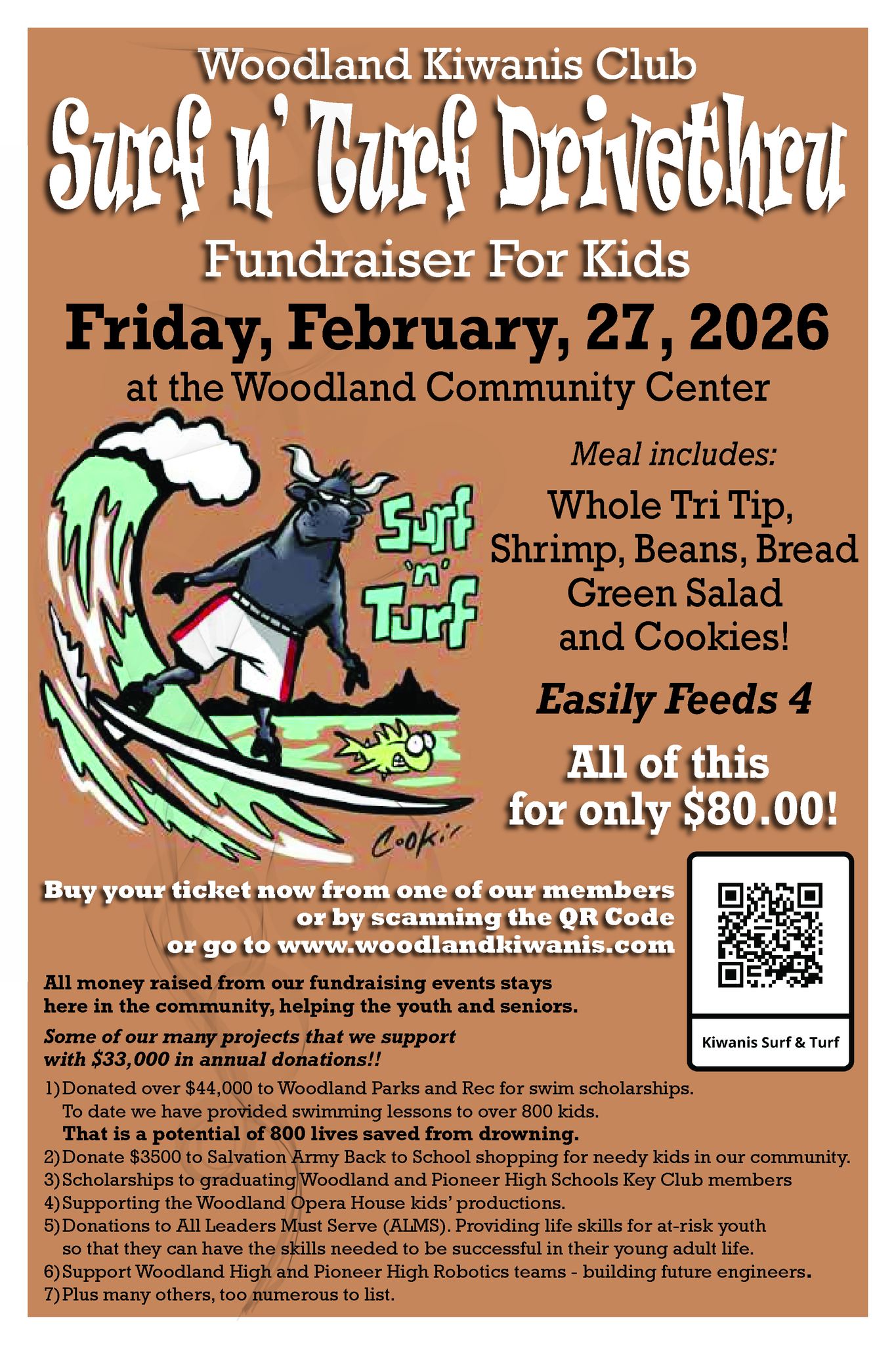 The Woodland Kiwanis Club is having a drive thru surf n turf event on Friday, February 27th. We have kept the price at only $80.00 for a meal that easily feeds 4 people. This is one of our major fundraisers that helps support the many community projects we are involved. These include swimming lessons for disadvantaged youth, supporting the Woodland PD toy giveaway for Christmas, scholarships to graduating seniors at both of Woodland’s high schools, child spree back-to-school shopping, supporting the youth productions at the Woodland Opera house, along with many other worthwhile causes. We donate over $30,000 each year back to the Woodland community. Just last weekend, we cooked hot dogs and provided chips for the grand opening of the new pool at the community center. What a great event to be part of. Please help us to keep funding these valuable community programs. Purchase your ticket by scanning the QR code on the flyer below, or going to woodlandkiwanis.com. Once there, click on the register button and enter your information and make payment. Thank you for your support.